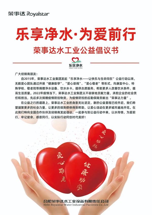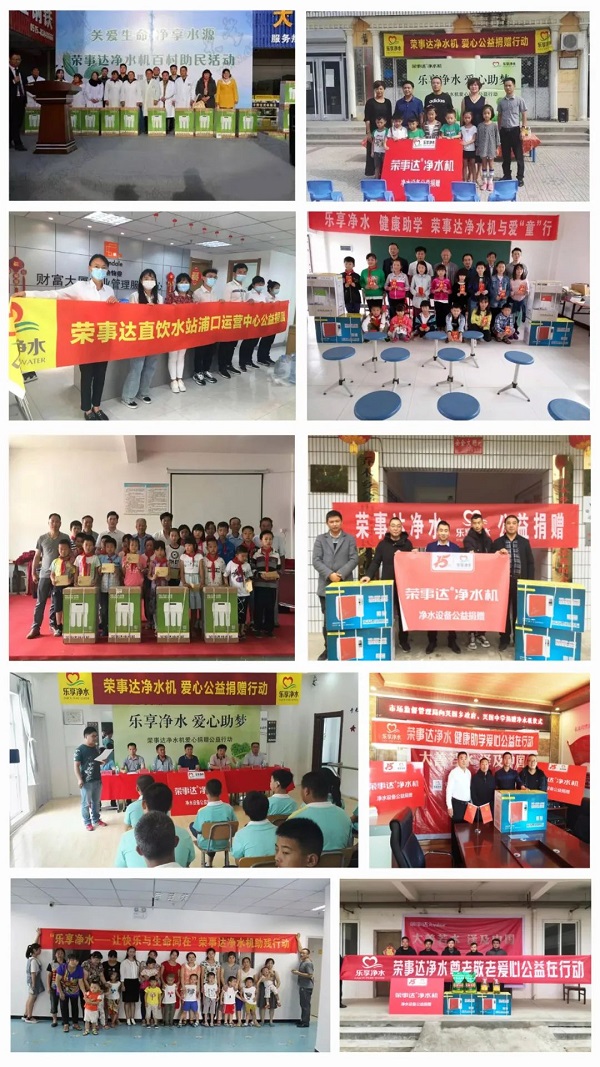 03 榮事達水工業(yè)經(jīng)銷商積極響應(yīng)集團公益倡議,熱衷于健康助學(xué)、愛心敬老、愛心助殘、疫情防控等多種形式的公益行動,截止到目前,經(jīng)銷商們的公益活動已遍及安徽、南京、湖南、江蘇、陜西、江西、河南、河北等多個地區(qū),以健康好水,溫暖每一個城市。