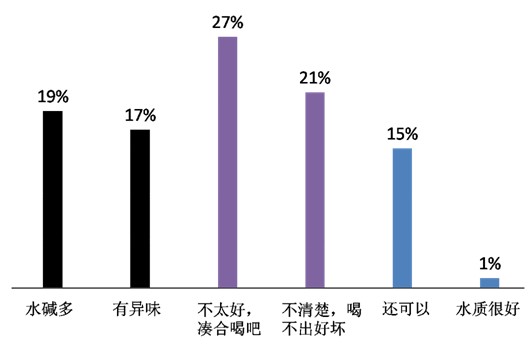 ——污染程度:六成被訪者對(duì)所住地區(qū)自來(lái)水的水質(zhì)表示不滿,其中多數(shù)人的感受是“不太好,湊合喝吧”(27%),明顯感覺(jué)到“有異味”的有17%,感覺(jué)“水堿多”的為19%。對(duì)水質(zhì)表示滿意的人很少,占全體被訪者的16%,其中15%覺(jué)得“水質(zhì)還可以”,只有1%覺(jué)得“水質(zhì)很好”。