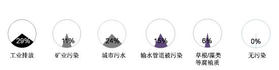 ——污染源:城市水污染主要與產(chǎn)業(yè)結(jié)構(gòu)有關(guān),工業(yè)排放(29%)和“礦業(yè)污染”(11%)對(duì)水資源的污染占到四成。值得關(guān)注的是,“城市污水”污染被24%被訪者認(rèn)為其是主要污染源。蘭州水污染事件讓人們注意到了“輸水管道被污染”對(duì)水安全造成的影響,15%被訪者認(rèn)為自己所住城市的水污染受此影響。有專(zhuān)家分析水污染,認(rèn)為“草根、藻類(lèi)等腐殖質(zhì)”是主要原因之一,被訪者中6%接受這一看法。