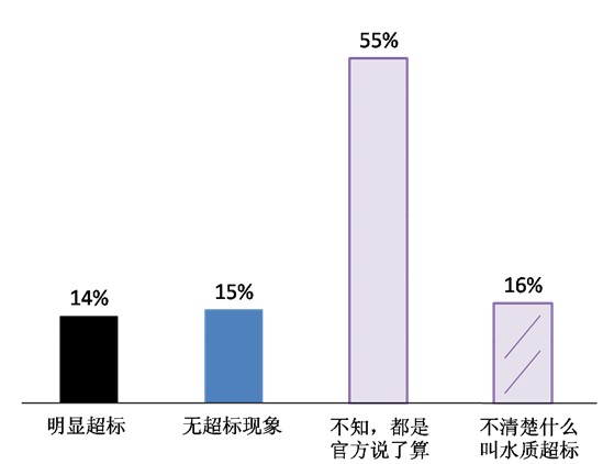 ——對(duì)于“水杯里的飲水安全”,只有不到三成的被訪者給了我們“明顯超標(biāo)”(14%)或“沒(méi)有超標(biāo)現(xiàn)象”(15%)的明確答案。七成被訪者對(duì)此一片茫然:55%被訪者表示“不知道,超不超標(biāo)都是官方說(shuō)了算”,16%的人甚至“不清楚什么叫水質(zhì)超標(biāo)”。