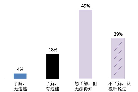 ——對(duì)“飲用水水源保護(hù)區(qū)”這一攸關(guān)群眾飲水安全和健康權(quán)的規(guī)定,只有兩成群眾表示“了解”,并明確地告訴我們“有違建項(xiàng)目”(18%)或“無(wú)違建項(xiàng)目”(4%)。八成被訪者對(duì)此并不知曉,29%的人“從沒(méi)聽(tīng)說(shuō)過(guò)”,也并沒(méi)有想要了解的意愿。半數(shù)(49%)被訪者“想了解”,但無(wú)奈于“信息不透明,無(wú)法得知”。