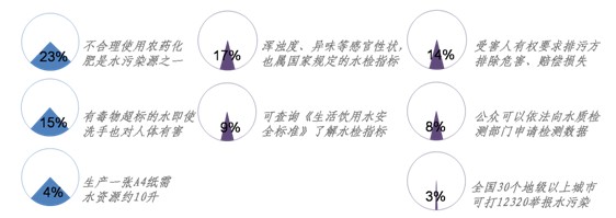 相對(duì)而言,人們對(duì)一些科普、知識(shí)性的信息認(rèn)知度較高,“過(guò)量、不合理使用化肥、農(nóng)藥是水污染源之一”已經(jīng)較為廣泛地被人們所了解(23%);不少人也清楚“汞、砷等有毒物超標(biāo)的水即使只是洗手也會(huì)對(duì)人體有害”(15%),即使是“生產(chǎn)一張A4紙所需要的水資源約10升”這樣的“冷知識(shí)”,也有一定被訪者有所了解(4%)。