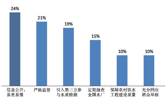 當(dāng)我們問(wèn)到“在水安全問(wèn)題上,目前最希望政府做些什么”,不少被訪者選擇了“依法嚴(yán)格監(jiān)管”(21%)、“引入第三方參與水質(zhì)檢測(cè)”(19%)、“定期對(duì)全國(guó)的水廠進(jìn)行抽查”(15%)和“保障農(nóng)村飲水工程建設(shè)質(zhì)量”(10%)。