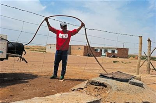 知情人告訴記者,在額里斯鎮(zhèn)沙漠腹地,有大約40多口挖掘深度大約在180米的取水井,均是供應工業(yè)園區(qū)生產(chǎn)用水。記者在一處編號為31號的供水井看到,水井的蓋子上寫著“慶華精細化工工業(yè)園供水”,知情人指著遠處一排排伸向沙漠腹地的電線桿說,每個線路的盡頭,都是這樣的水井,逐年增多,井也越挖越深。